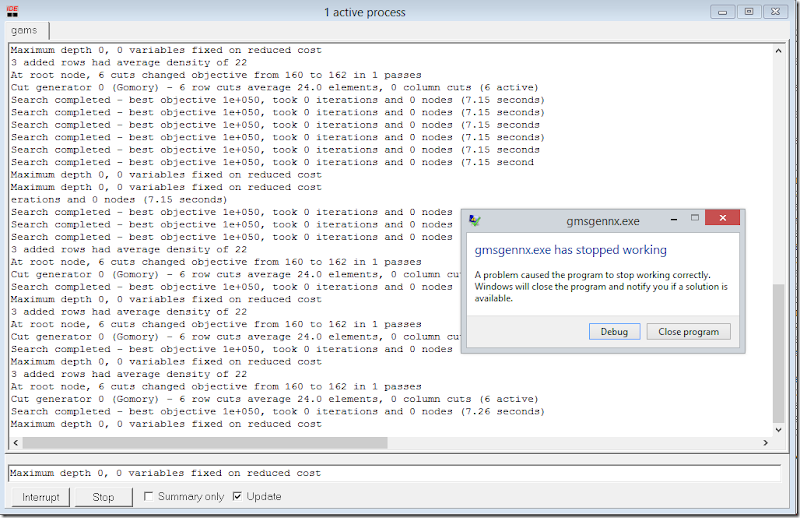 After recompiling from sources I could run the problem with multiple threads (when reading from MPS files). May be a build problem in the GAMS version of CBC. But now I see my LP files are no longer accepted:| Coin3007W ### CoinLpIO::is_invalid_name(): Name is empty Coin3007W ### CoinLpIO::are_invalid_names(): Invalid name: vnames[1396]: (null) Coin3007W ### CoinLpIO::setLpDataRowAndColNames(): Invalid row names |